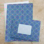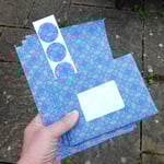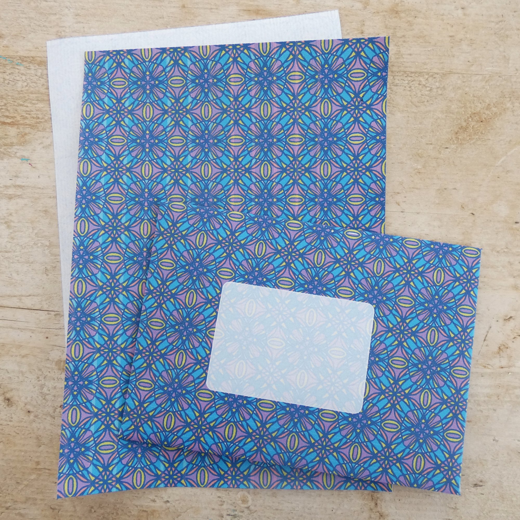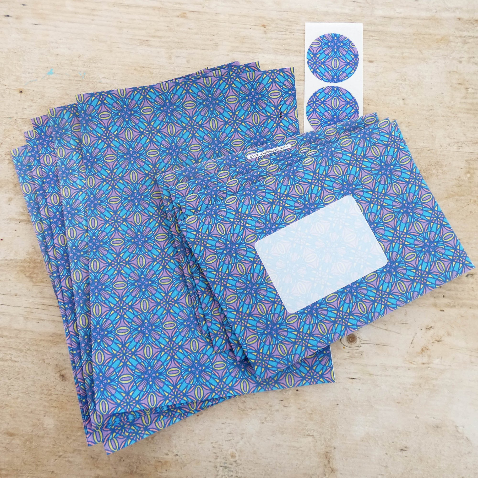 8 A5 sheets of paper, decorated one side and plain on the other and 4 decorated C6 envelopes - made from Heritage white wove recycled paper