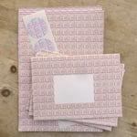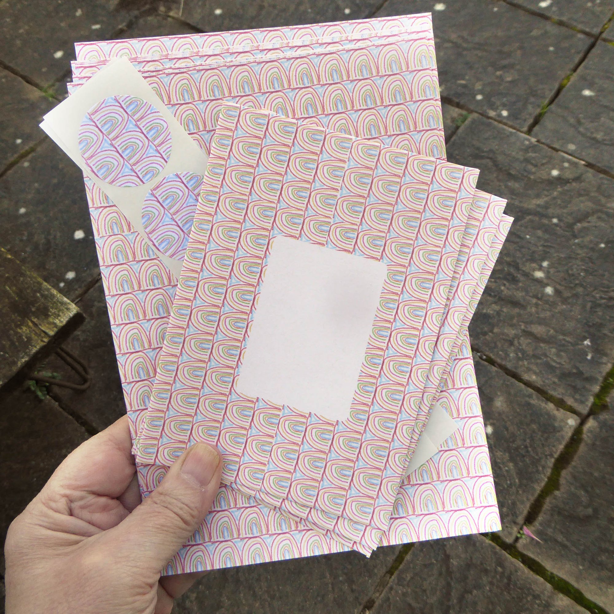8 A5 sheets of paper, decorated one side and plain on the other and 4 decorated C6 envelopes - made from Heritage white wove recycled paper