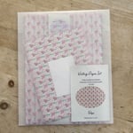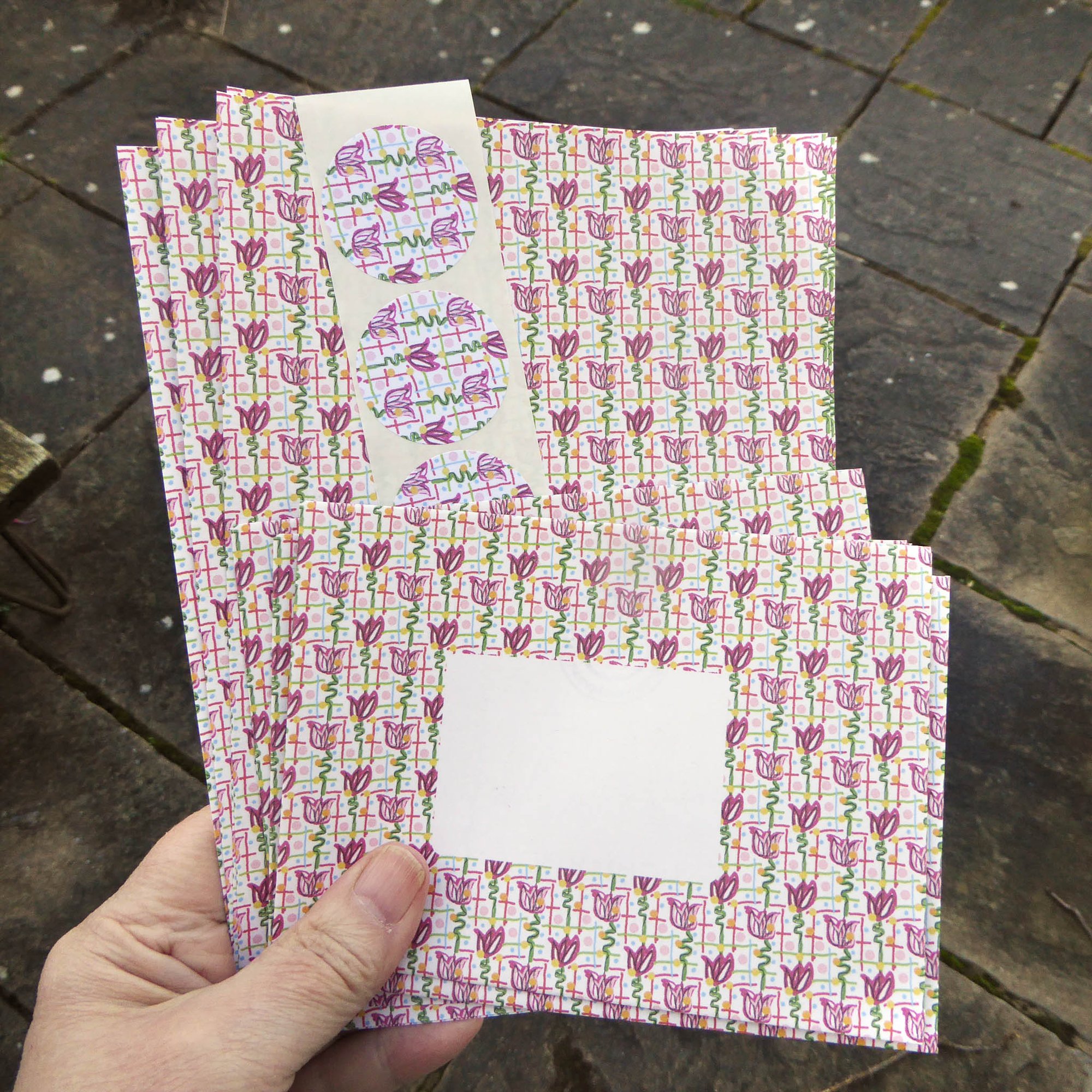 8 A5 sheets of paper, decorated one side and plain on the other and 4 decorated C6 envelopes - made from Heritage white wove recycled paper