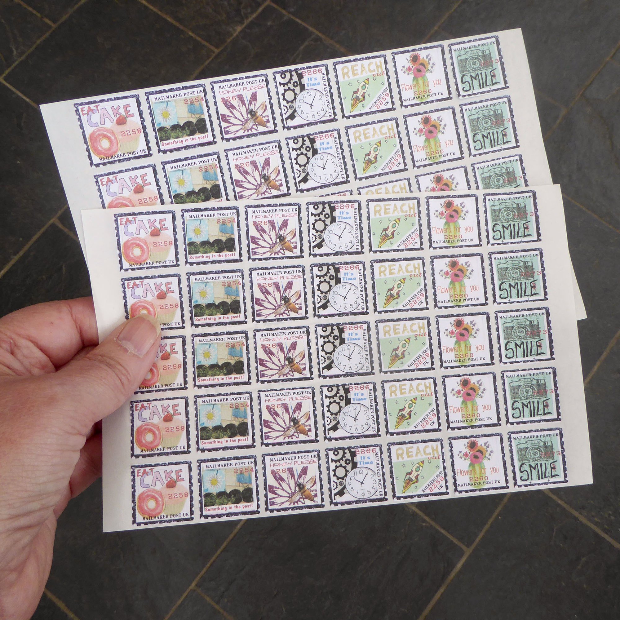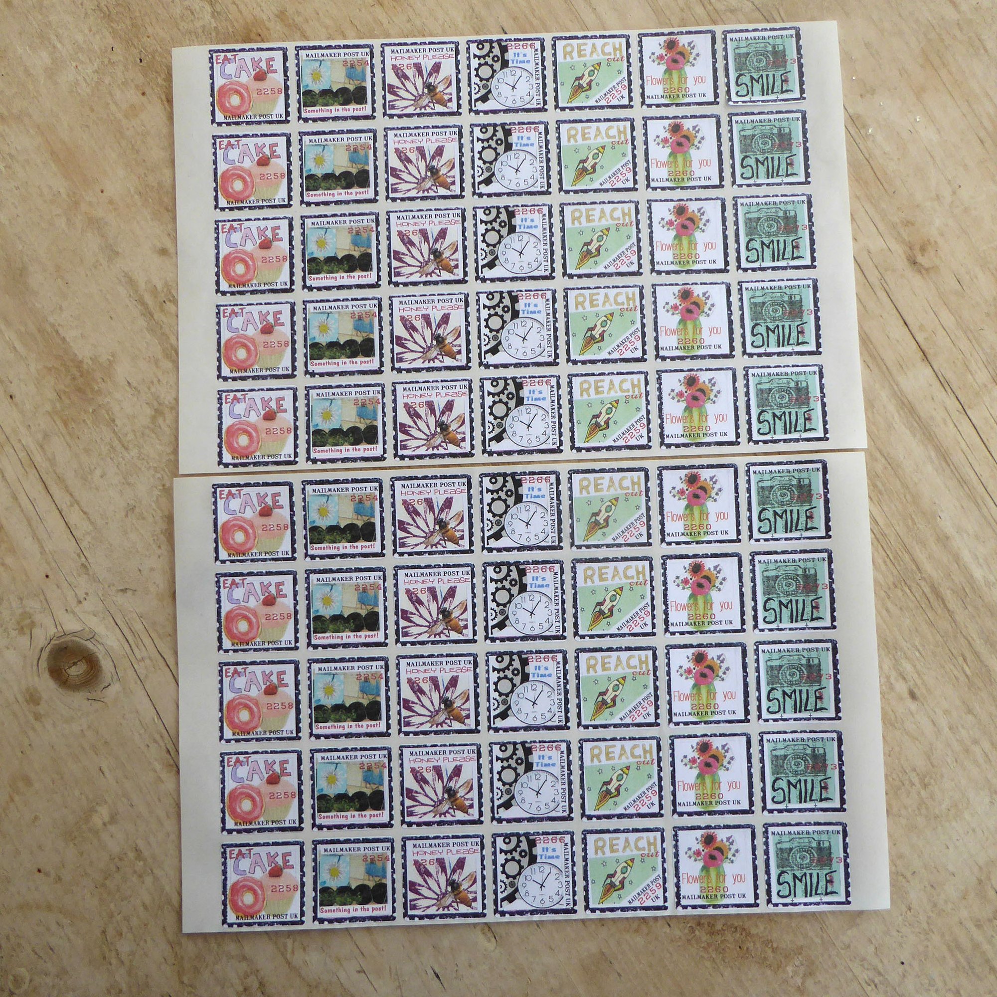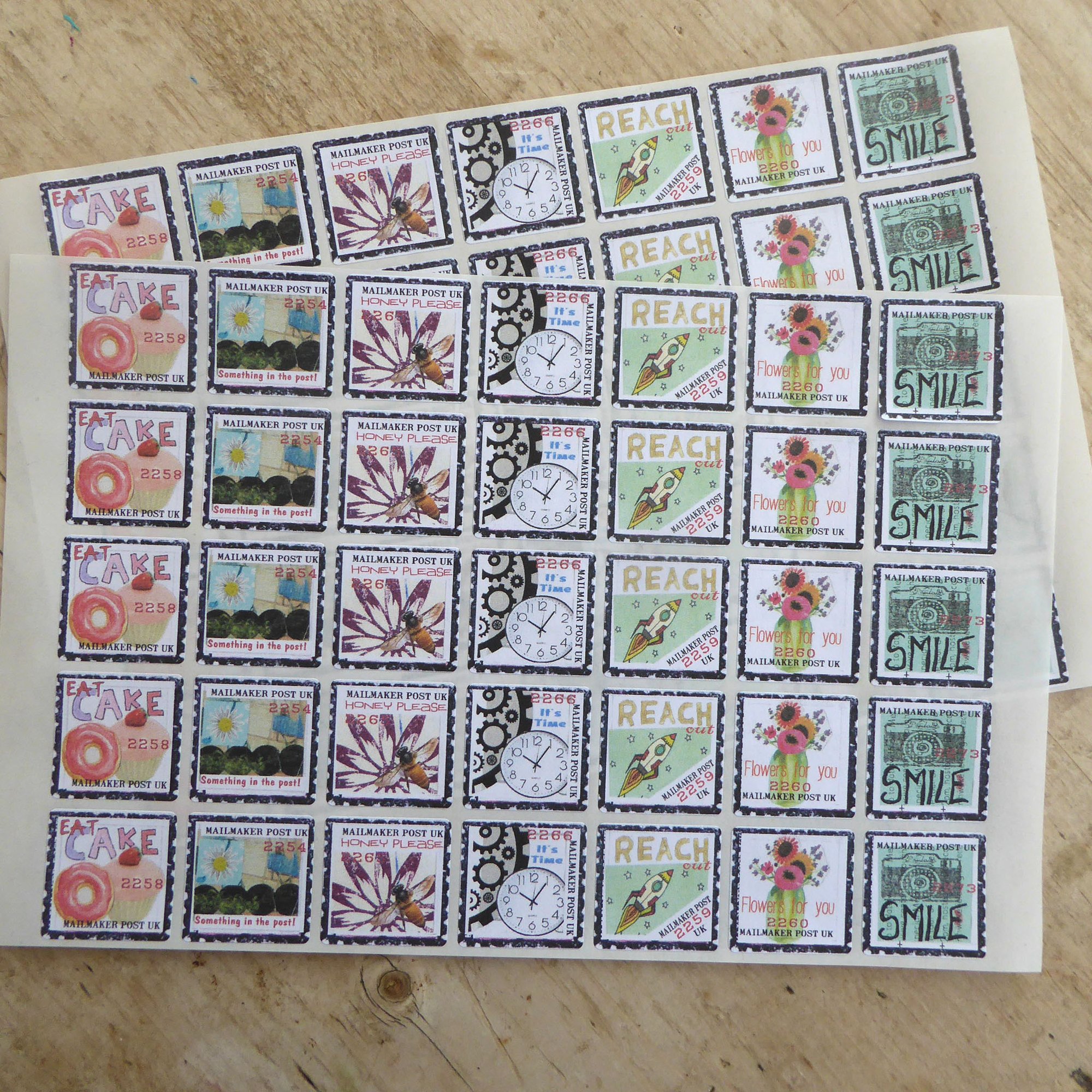 This listing is for 2 sheets of self adhesive faux postage stamps, just peel and stick!